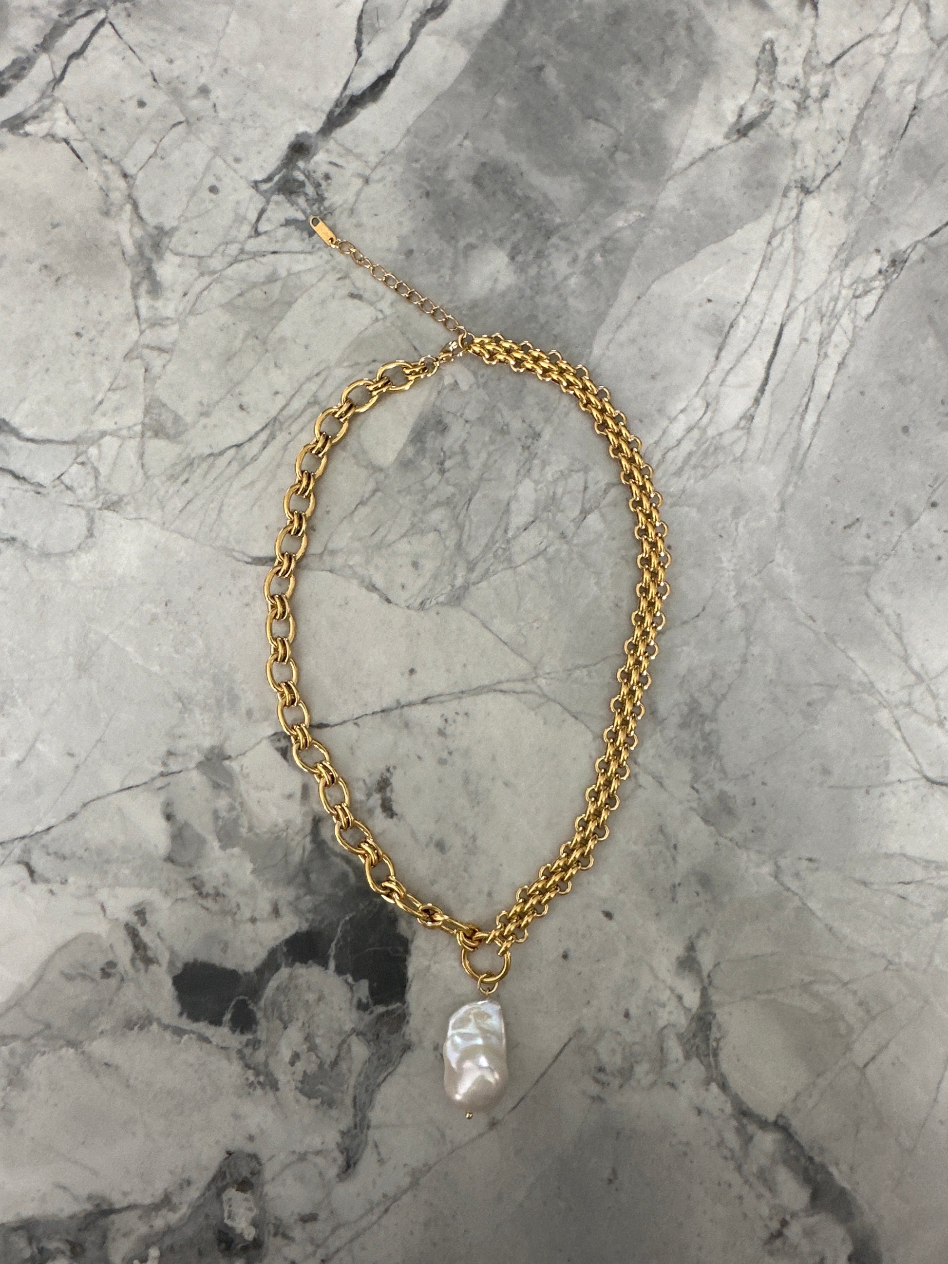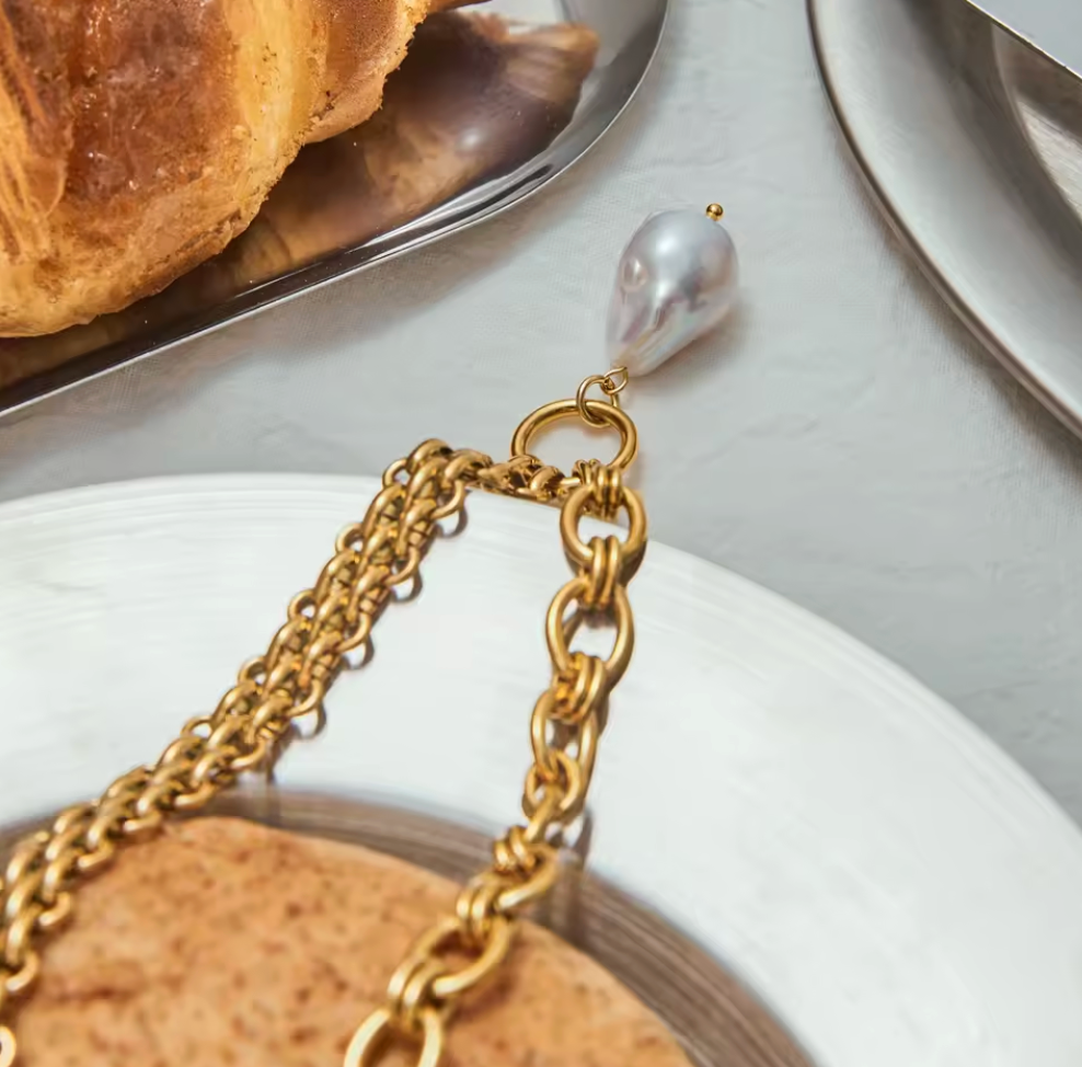 Bold, organic, and effortlessly elegant. This waterproof 18k gold-plated necklace features lustrous baroque pearls, each with its own unique shape and natural beauty. Designed as a true statement piece, it blends modern luxury with timeless charm — perfect for elevating any look.