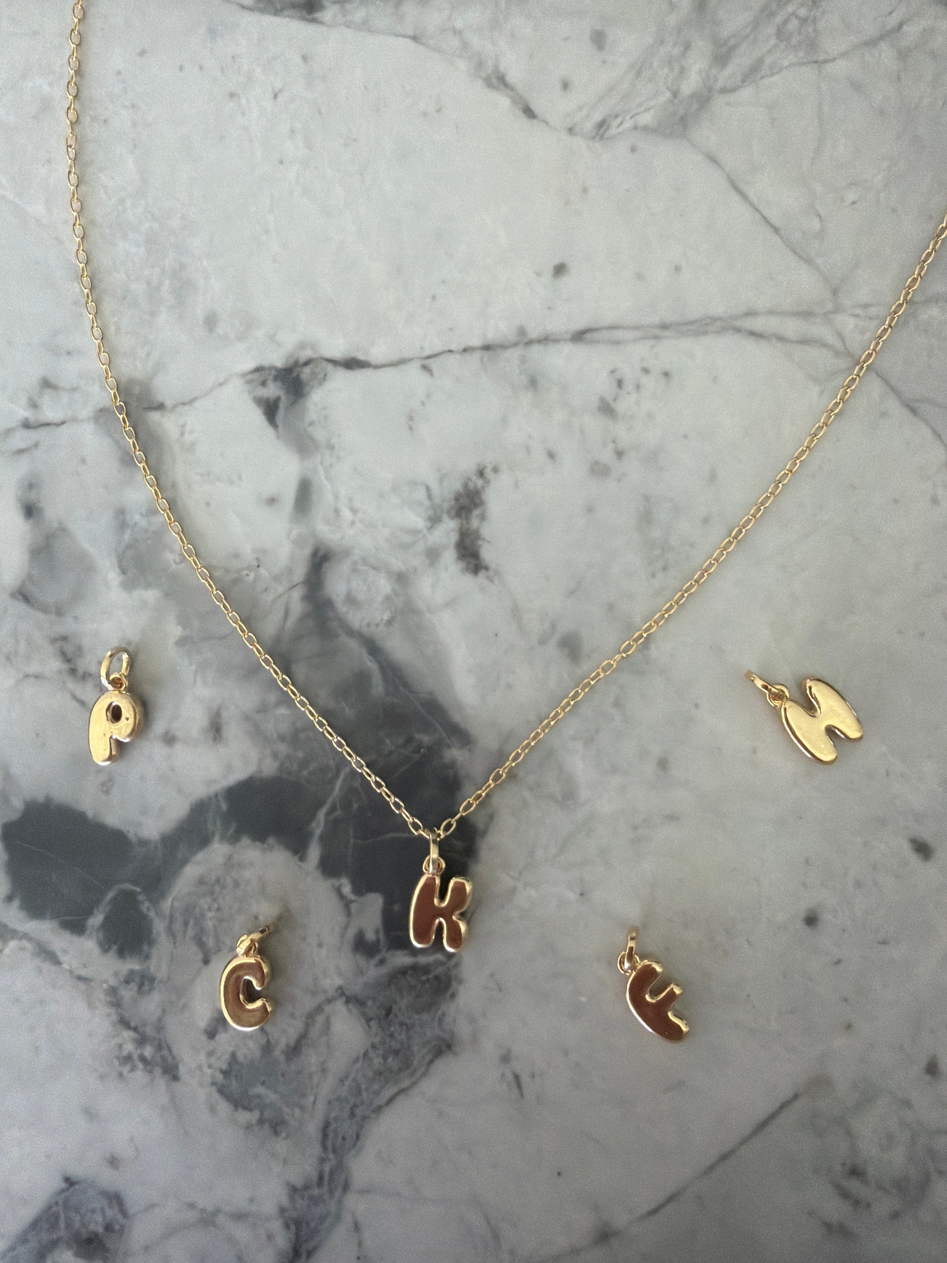 A playful, modern necklace featuring bubble-style letters crafted in durable 18K gold-filled metal. Personalize your look with initials or spell out a word, combining everyday wearability with bold, contemporary style.