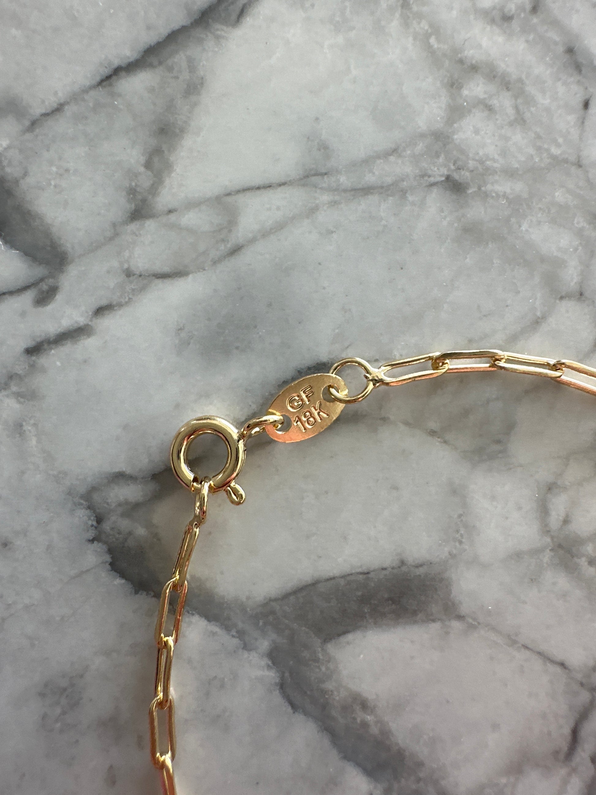 Delicate by design. This 18k gold-filled bracelet features fine, dainty links that bring subtle shimmer and elegance to your wrist. At 15.24cm, it offers a close, graceful fit—perfect for stacking or wearing solo.