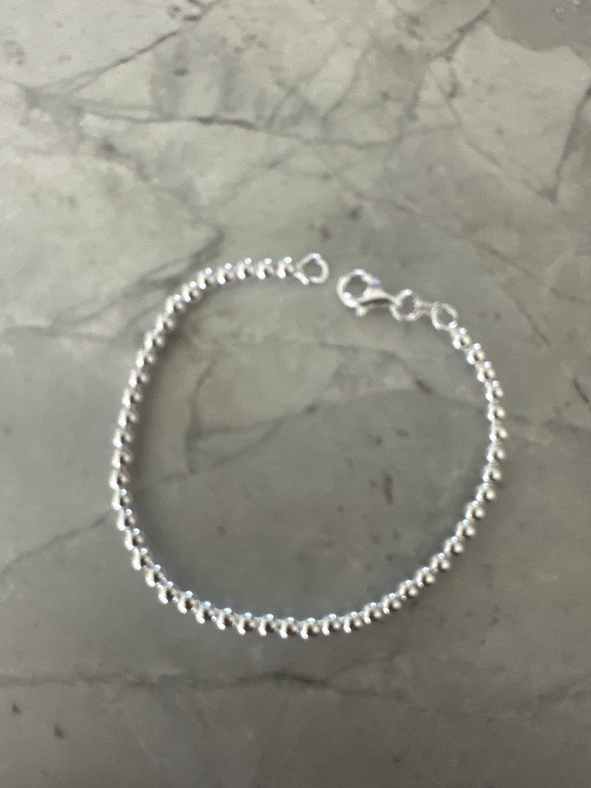 Classic and versatile. This sterling silver bracelet features a delicate string of polished beads, designed to sit comfortably on smaller wrists. A timeless staple for everyday wear.