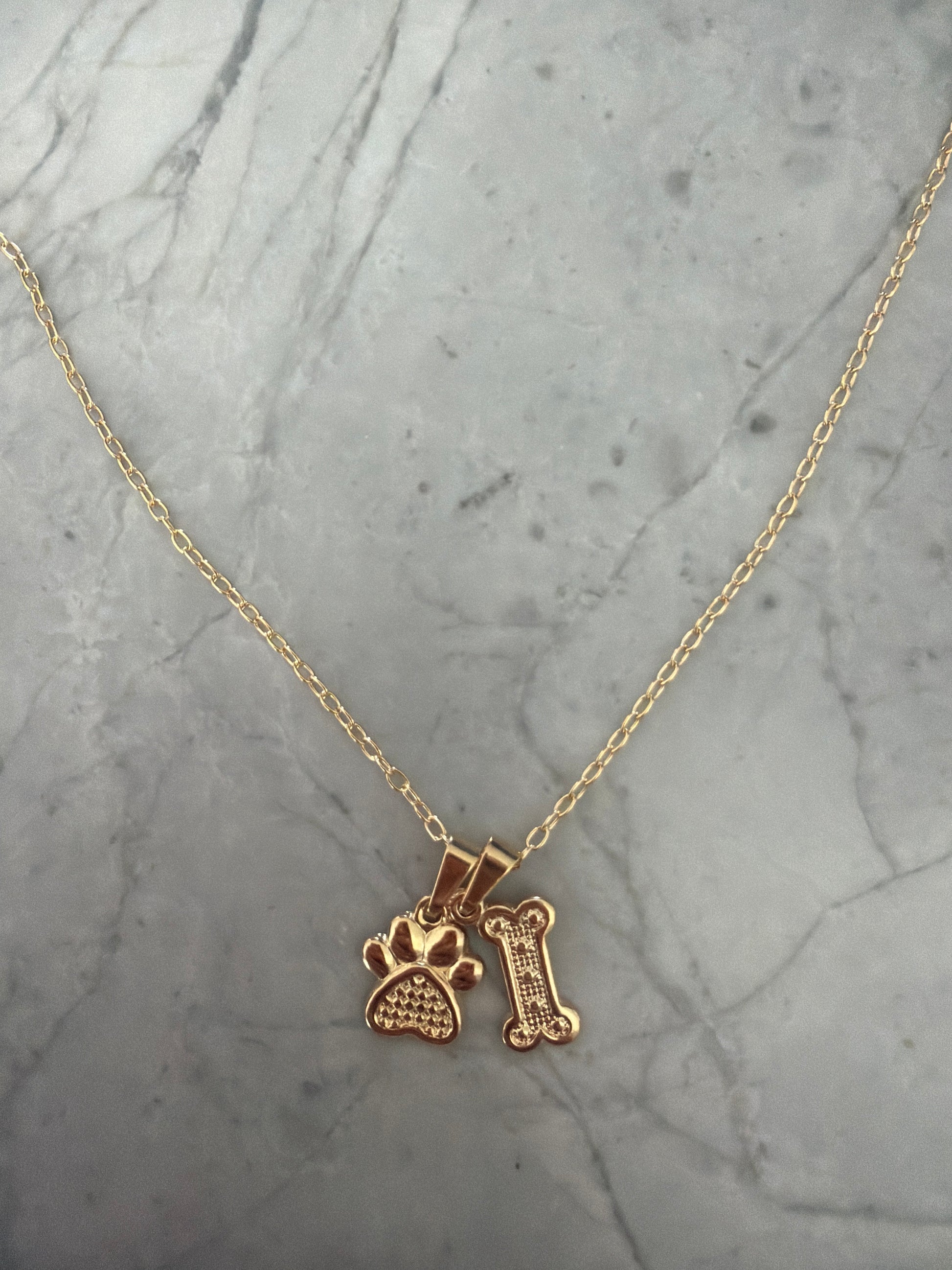 A playful and versatile necklace featuring removable paw and dog charms on a durable 18K gold-filled chain. Customize your look by wearing it as a simple chain, with one charm, or both for a fun, layered effect.