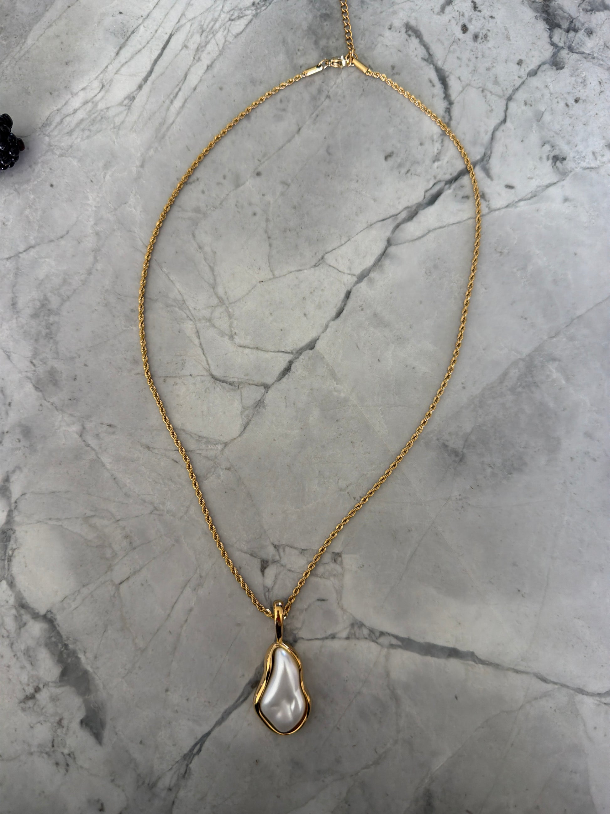 Baroque Pearl Pendant featuring a naturally irregular freshwater pearl, finished in 18K gold plating with a sealed waterproof coating. Each pendant is one of a kind due to the organic shape of the pearl. Designed for regular wear, including water exposure, without compromise to colour or surface finish. Sample sale piece.